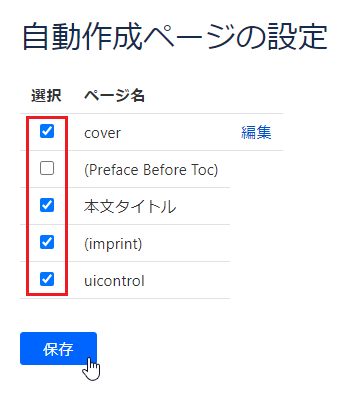 「自動作成ページの設定」画面が表示されます。デフォルトに設定したいページを選択し、[保存]をクリックします。