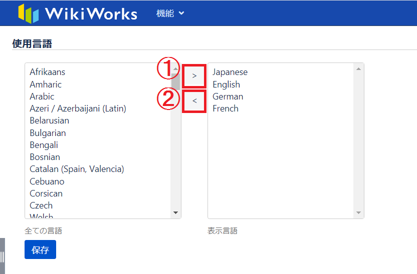 | ① | 全ての言語(左表)より選択した言語を、表示言語(右表)に取り込みます。 表示言語(右表)に設定することで、言語リストの最上部に表示されます。 |