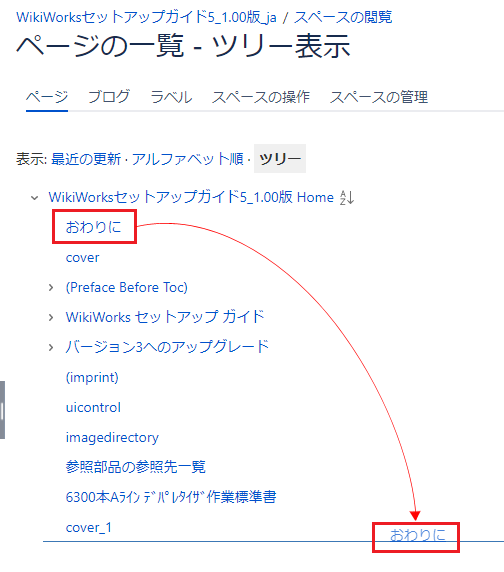 作成したページは、スペース内の階層(章、節、項)ごとにページタイトルの先頭文字が数字、アルファベット、五十音の順番で、自動的に並べ替えられます。