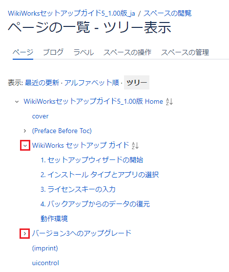ページの一覧がツリー形式で表示されます。Unable to render {include} The included page could not be found.[>]をクリックすると[v]に変わり、下の階層のページを表示できます。