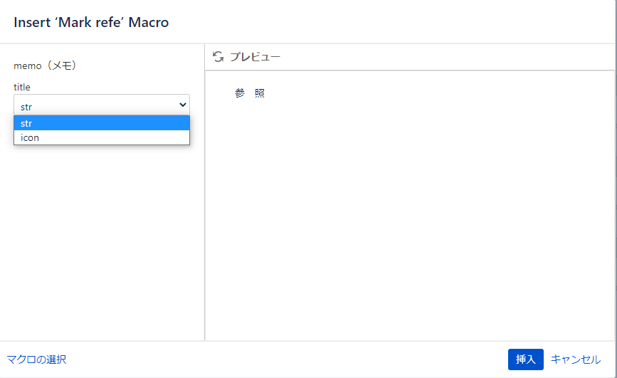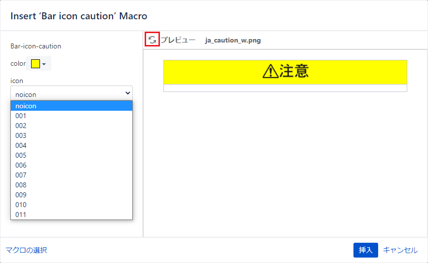 選択したスタイルマクロの[マクロの挿入]ダイアログが表示されます。 プルダウンメニューから表示する「icon」を選択します。