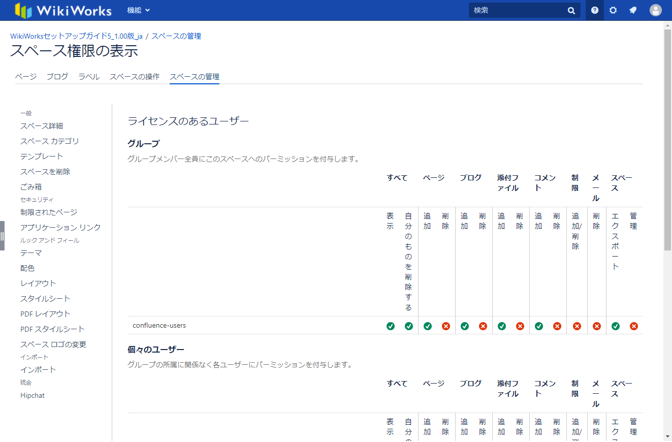 - [スペース権限]の[個々のスペース]の中から復元したいページが含まれるドキュメント名の操作列にある[権限の管理]をクリックします。