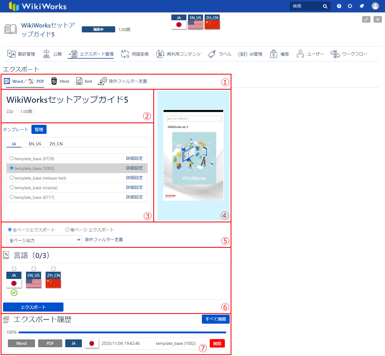 1 エクスポートメニュー 「Word/PDF」、「HTML」、「Xml」、「除外フィルター定義」を選択できます。