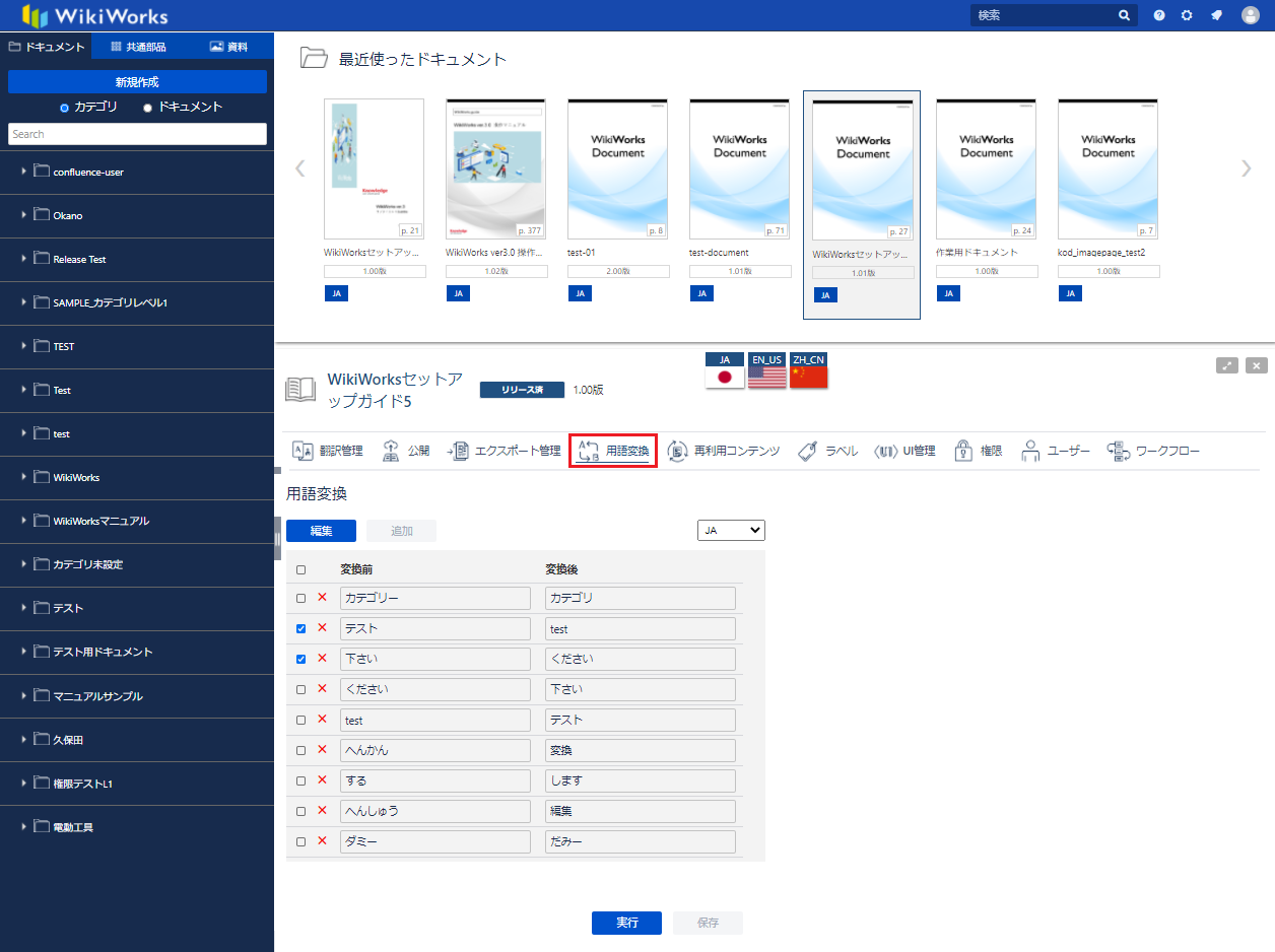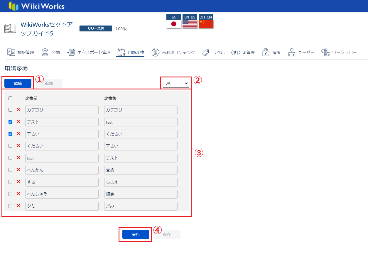 を入れる事で、用語変換を行う用語を選択できます。3 実行ボタン ②のチェックボックスでチェックされている用語を実行します。