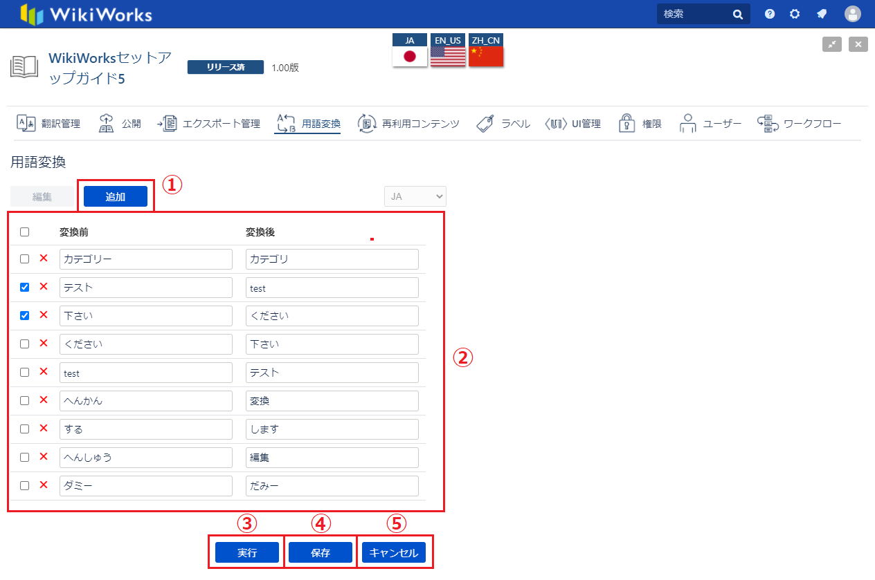 チェックの入っている用語の変換が実行されます。4 実行ボタン 実行ボタン:③のチェックボックスでチェックされている用語を実行します。
