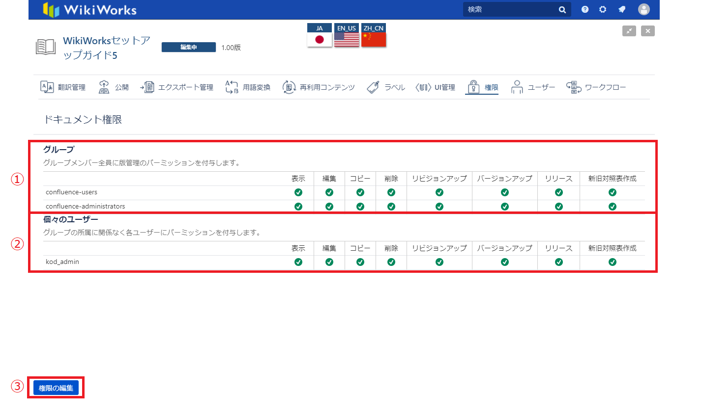 | 3 | [権限の編集]ボタン | 現在設定されている権限の変更や追加、削除を行うことができます。 |