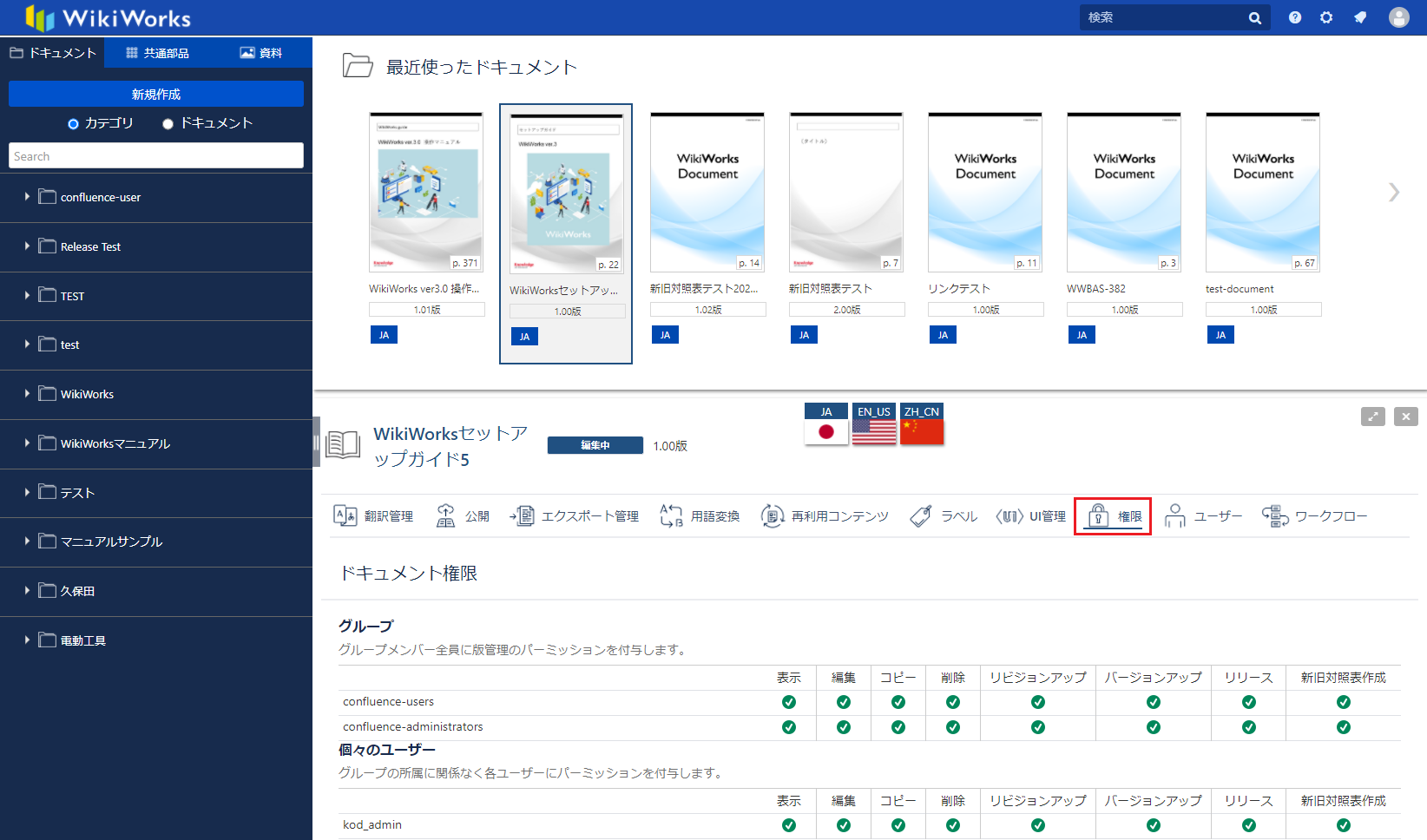 ドキュメント権限はグループおよび個々のユーザー毎に設定することが可能です。