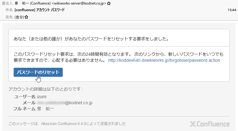 - 受信した「[Confluence]アカウント パスワード」メールを開き、[パスワードのリセット]をクリックします。