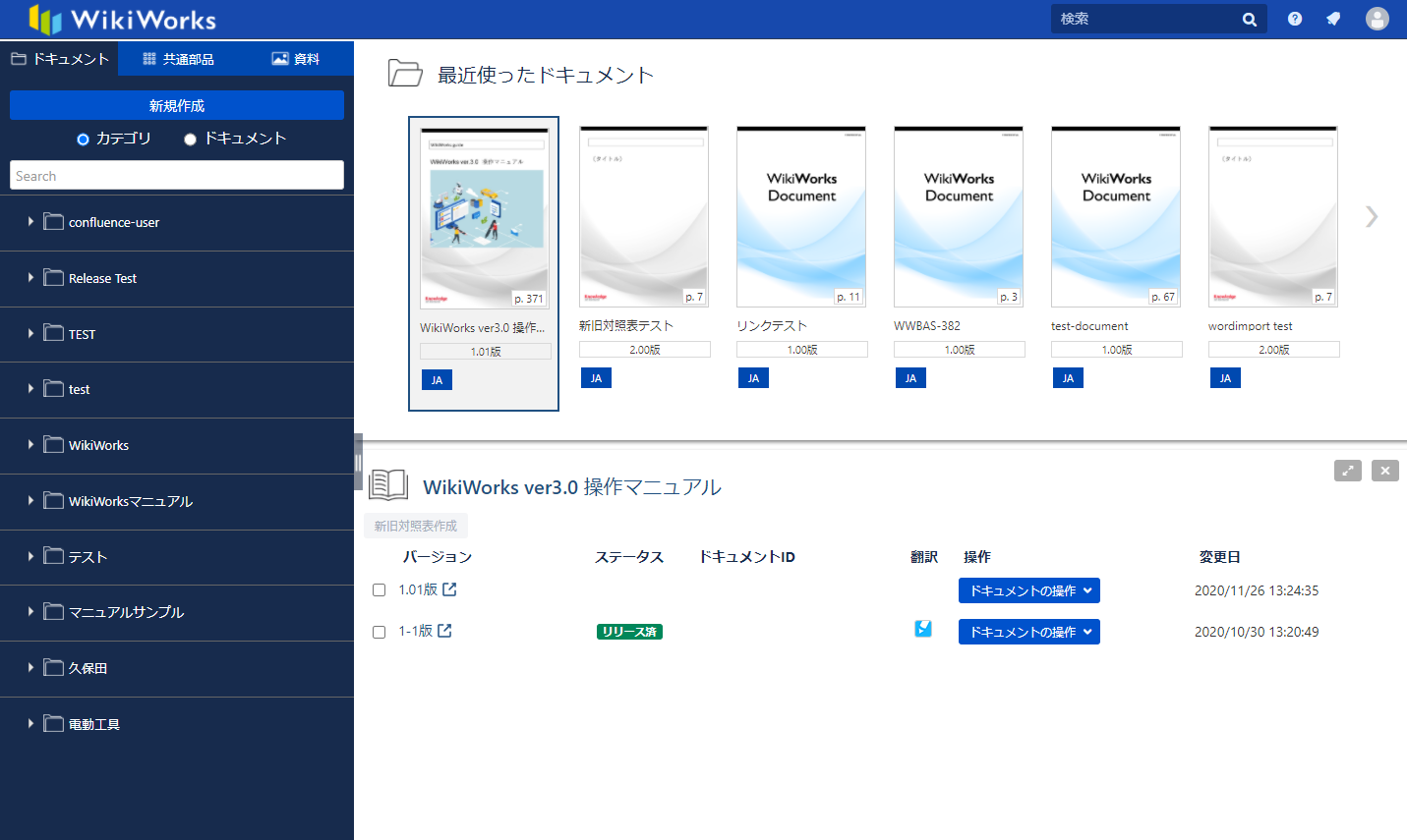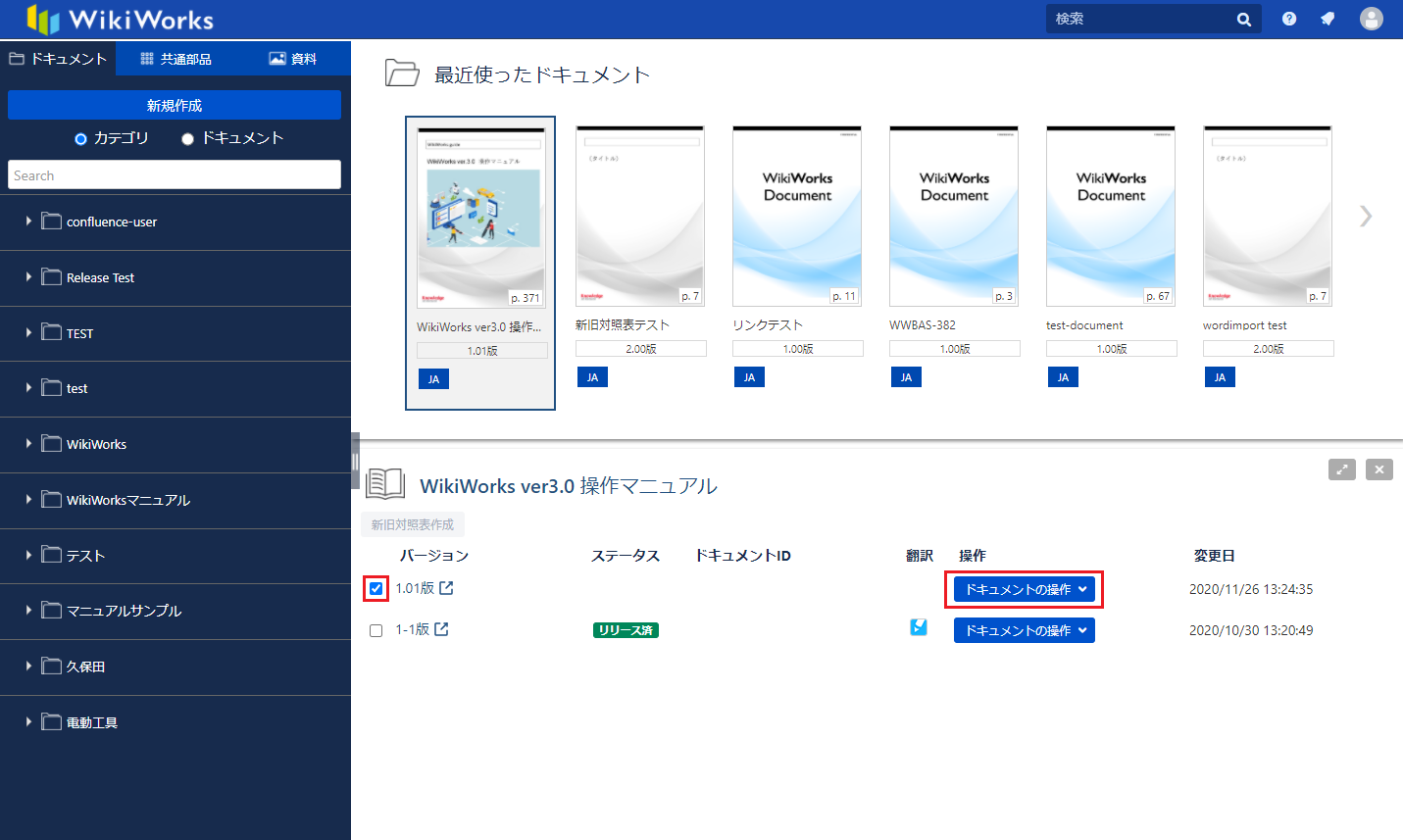 - トップ画面から表示されているドキュメントを選択すると、選択したドキュメントの版情報が下記に表示されます。