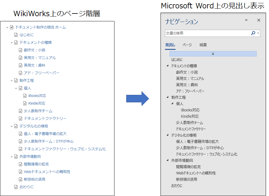 WikiWorksで作成したページ階層は、Wordエクスポート時には次のように再現されます。