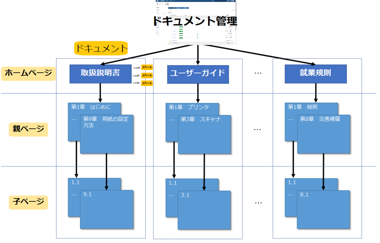 最上位階層のページタイトルは「章見出し」、その配下に作成されたページは「節」階層、「節」階層のページの配下に作成されたページは「項」階層となります。