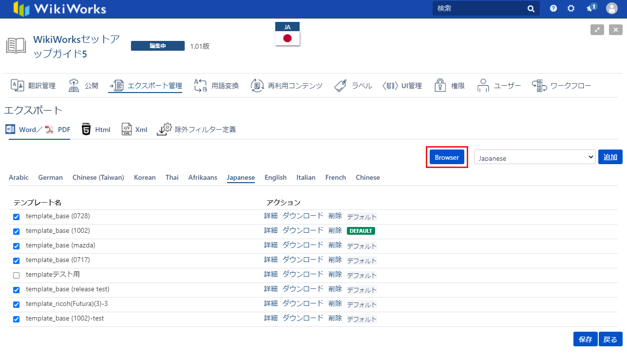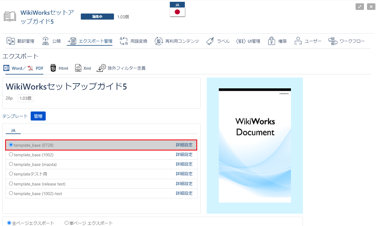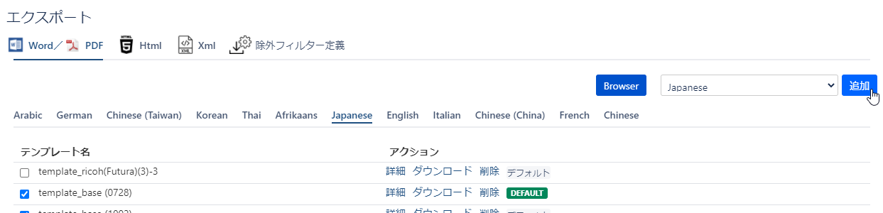 - 「エクスポート管理」に戻ると、選択したテンプレートが表示されデフォルトも設定されています。