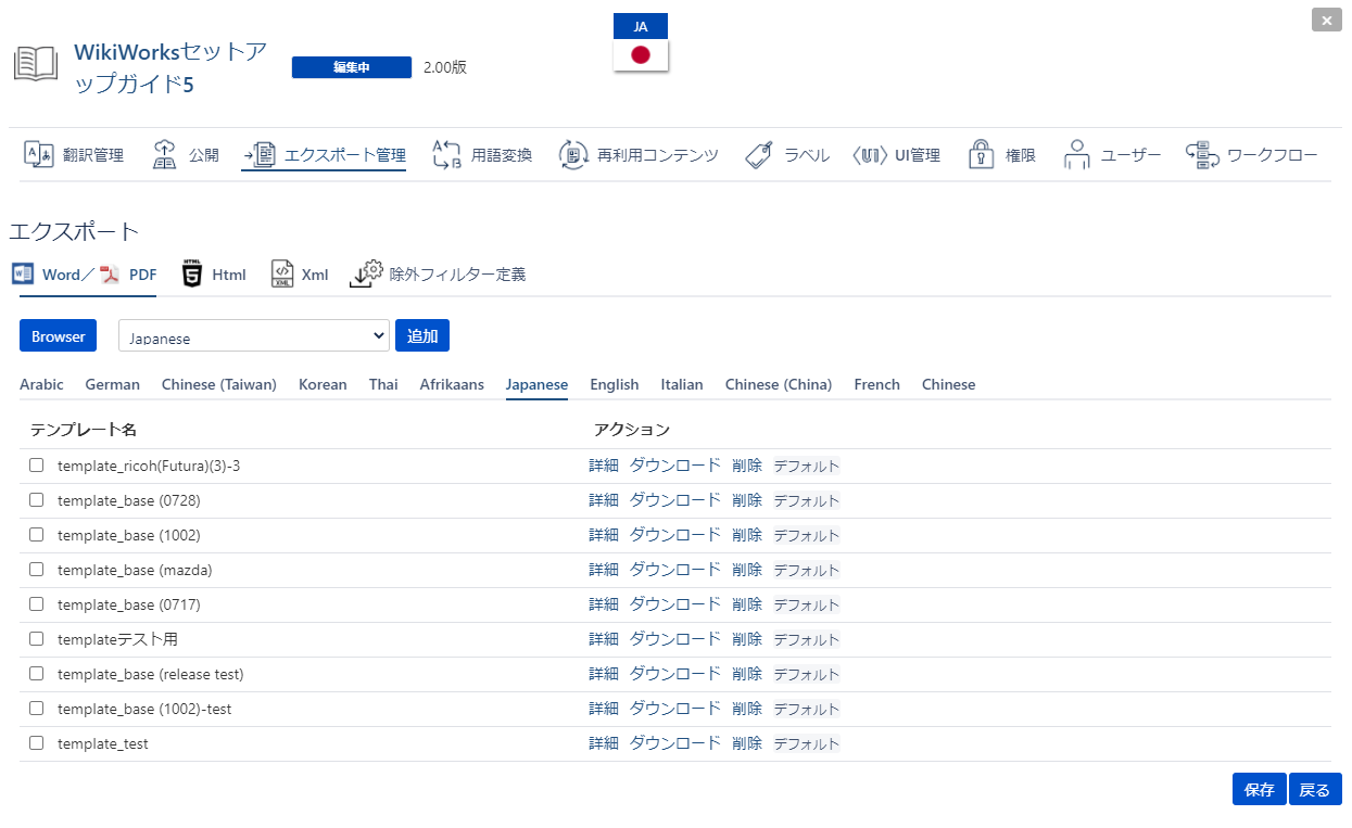 - 「詳細」をクリックすると、templateの詳細画面に入り、docx、json、tsvを確認、ダウンロード、アップロードすることができます。