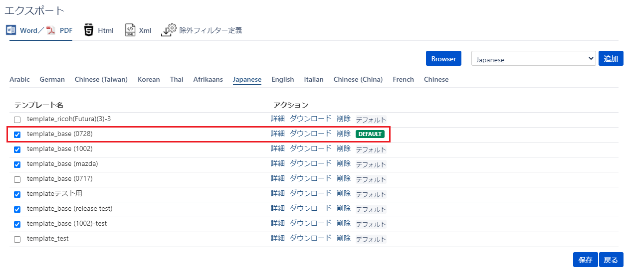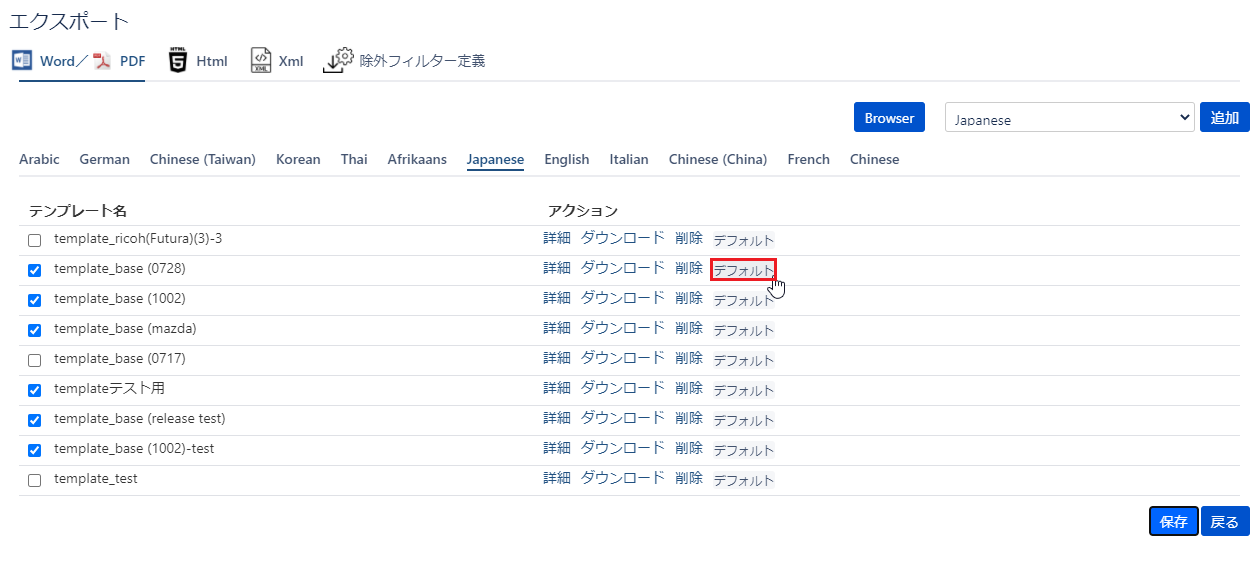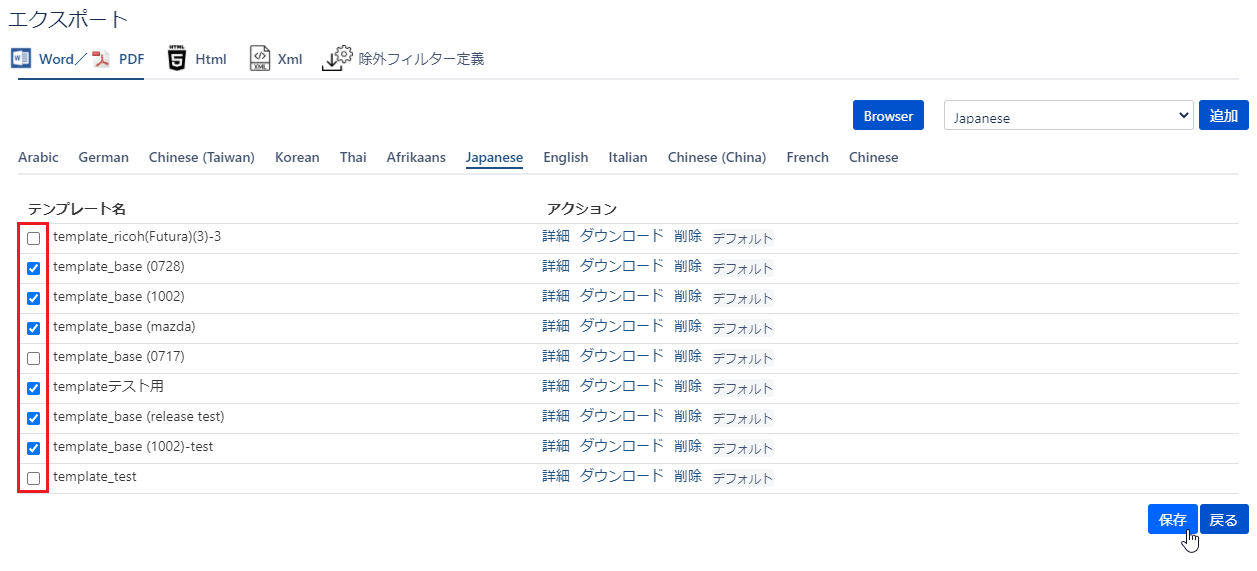 - 言語を選択し、使用したいテンプレートの左横の枠にチェックを入れ[保存]をクリックします。