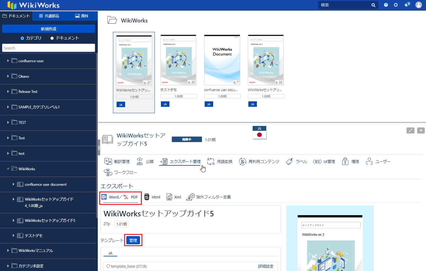 Unable to render {include} The included page could not be found.Wordテンプレートの作成時は、「Wordエクスポートスタイル一覧」や「Wordエクスポート制限事項」を参照して下さい。 - [エクスポート管理]をクリックし、「Word/PDF」を選択して[管理]ボタンをクリックします。