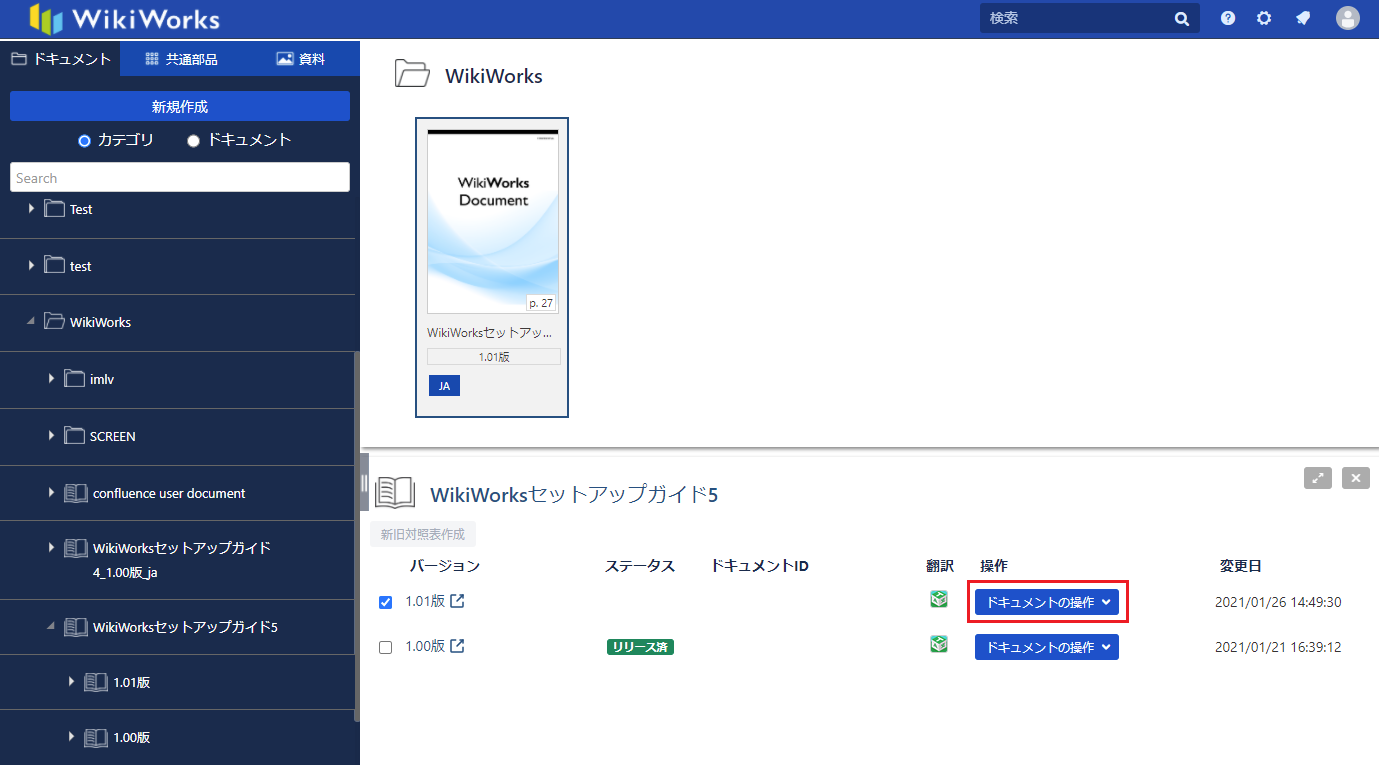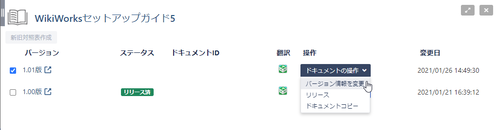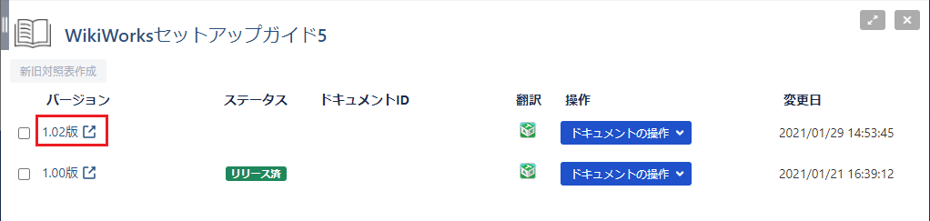 - バージョンを変更したい、リリース前のドキュメントを選択し[ドキュメントの操作]をクリックします。
