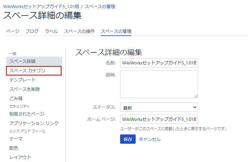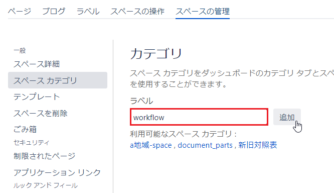 カテゴリ(ラベル)を設定するとワークフローが有効化され、スペースのホームページにワークフローメニューが表示されます。