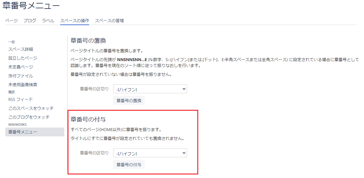 「章番号メニュー」機能では、スペース内のすべてのページに一括して章番号を付与できます。章番号を付与するとスペース全体の構成を把握しやすくなります。