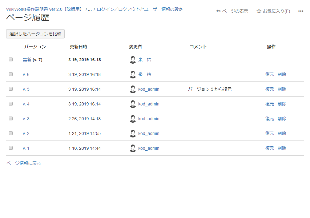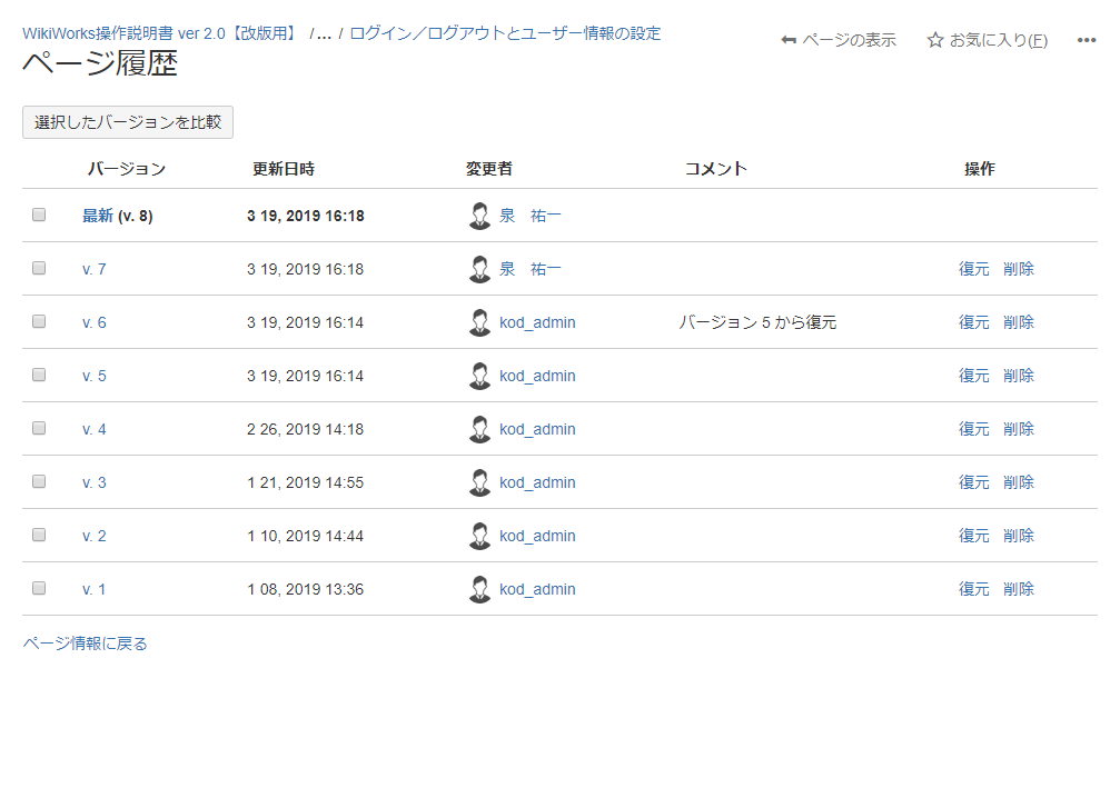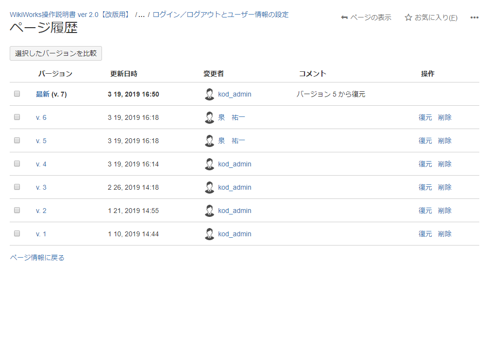 選択したバージョンの内容が復元され、ページが閲覧画面で表示されます。