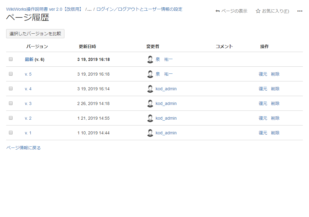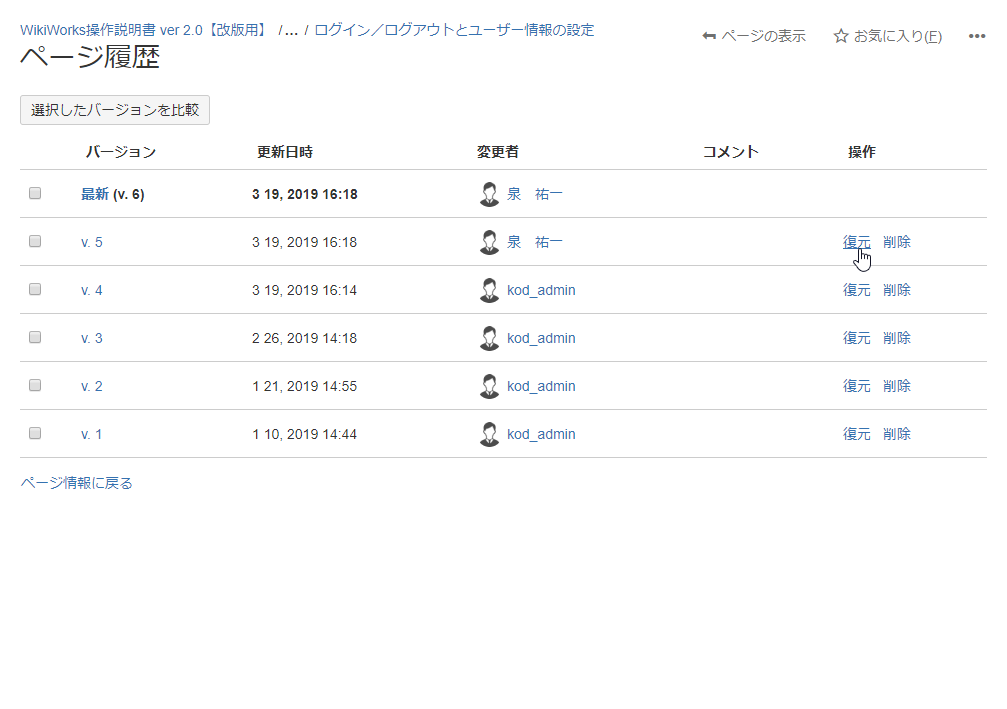 - バージョンを復元したいページの[ページ履歴]画面を表示します。