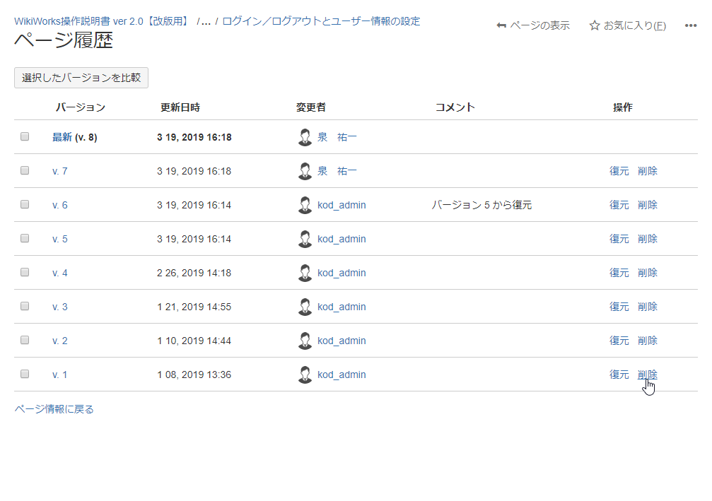「ページ履歴」機能では、ページの内容を以前のバージョンに戻したり、以前のバージョンを削除したりすることができます。