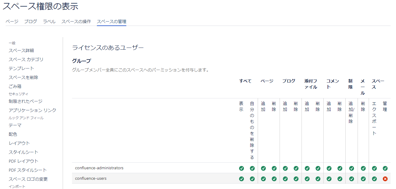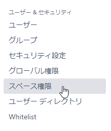 - 左メニューの[ユーザー&セキュリティ]から[スペース権限]をクリックします。