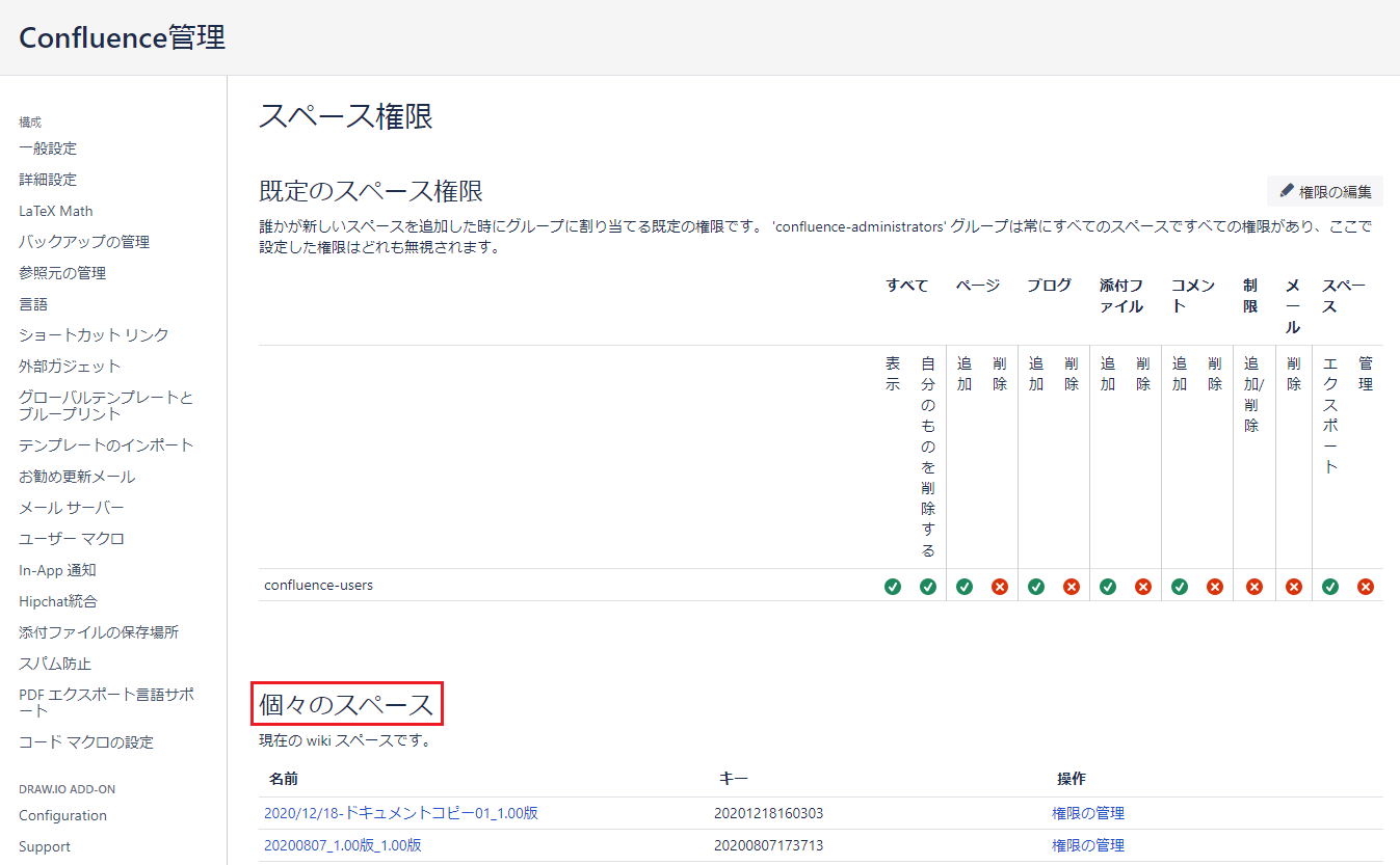 - [スペース権限]の[個々のスペース]の中から復元したいページが含まれるドキュメント名の操作列にある[権限の管理]をクリックします。
