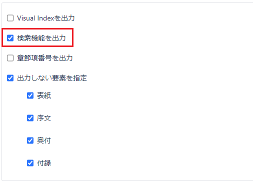 HTMLファイルに検索機能を追加するには、HTMLファイルをエクスポートする際に、「検索機能を出力」にチェックを入れる必要があります。