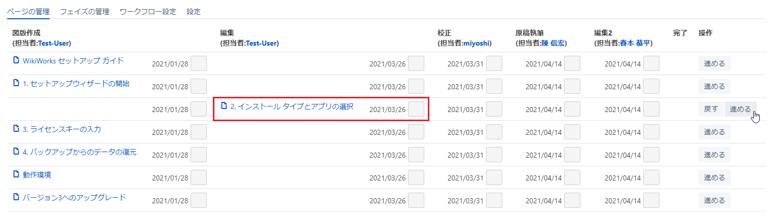 [ワークフロー管理画面]の[ページの管理]タブが表示されます。 修正したいページの[操作]欄で、[戻す]または[進める]ボタンをクリックします。