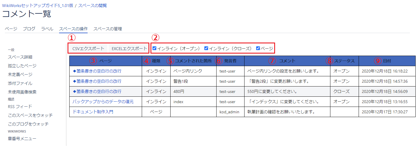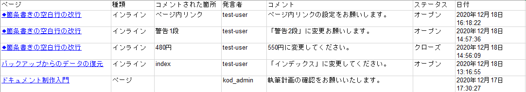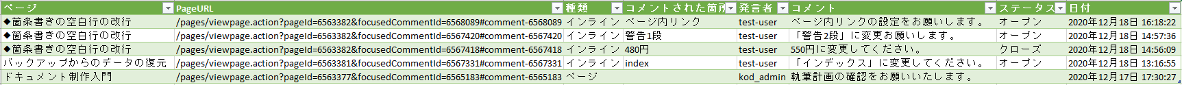 | 3 | ページ | コメントが入力されているページのタイトルです。 クリックすると、該当のページが表示されます。 |