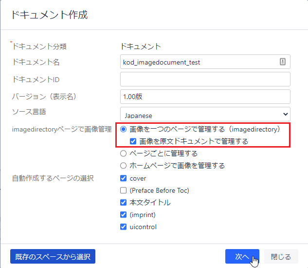 - 「imagedirectoryページで画像管理」の【画像を一つのページで管理する(imagedirectory)】と【画像を原文ドキュメントで管理する】にチェックを入れます。