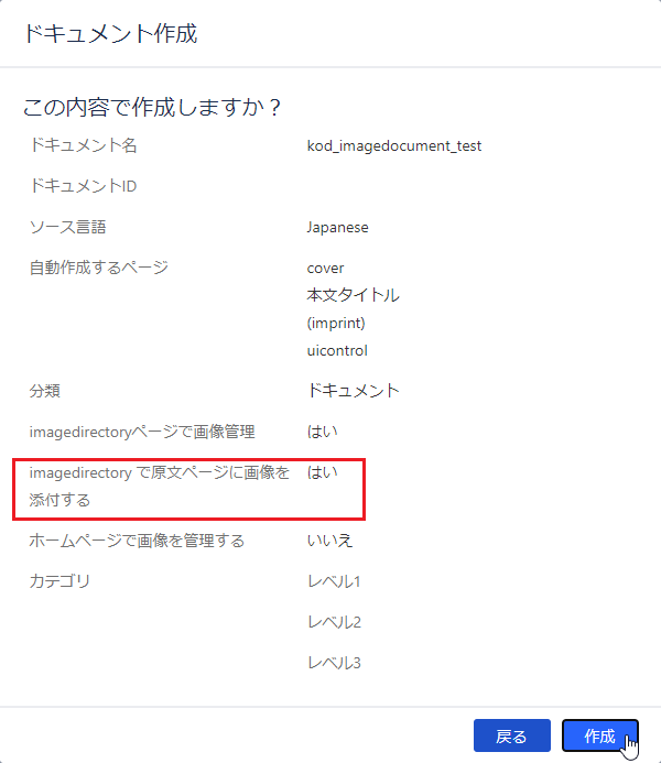 確認画面が表示されます。「imagedirectoryで原文ページに画像を添付する」の項目が「はい」になっていることを確認し、[作成]ボタンをクリックします。