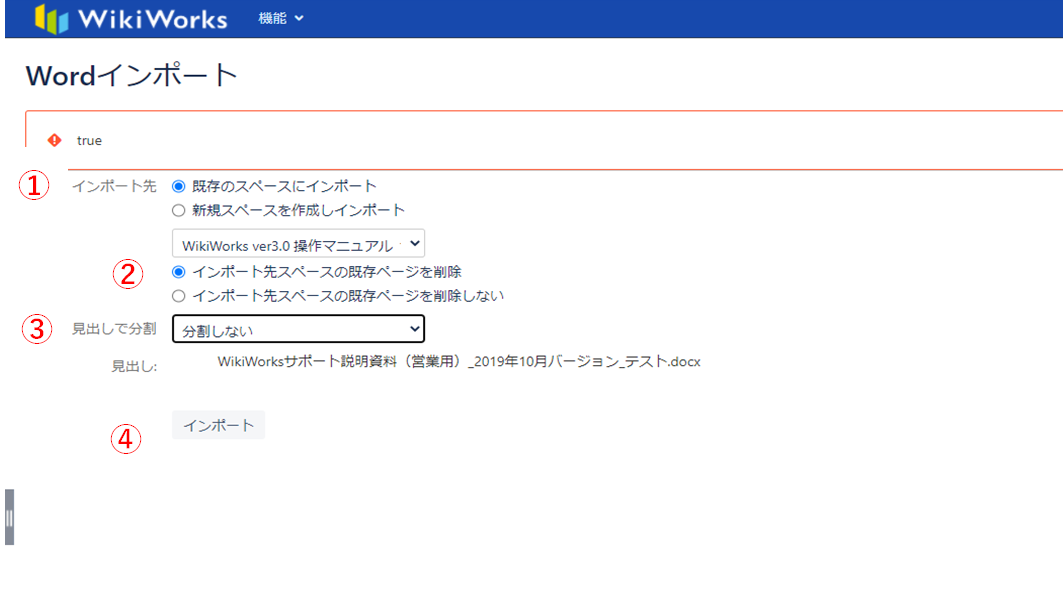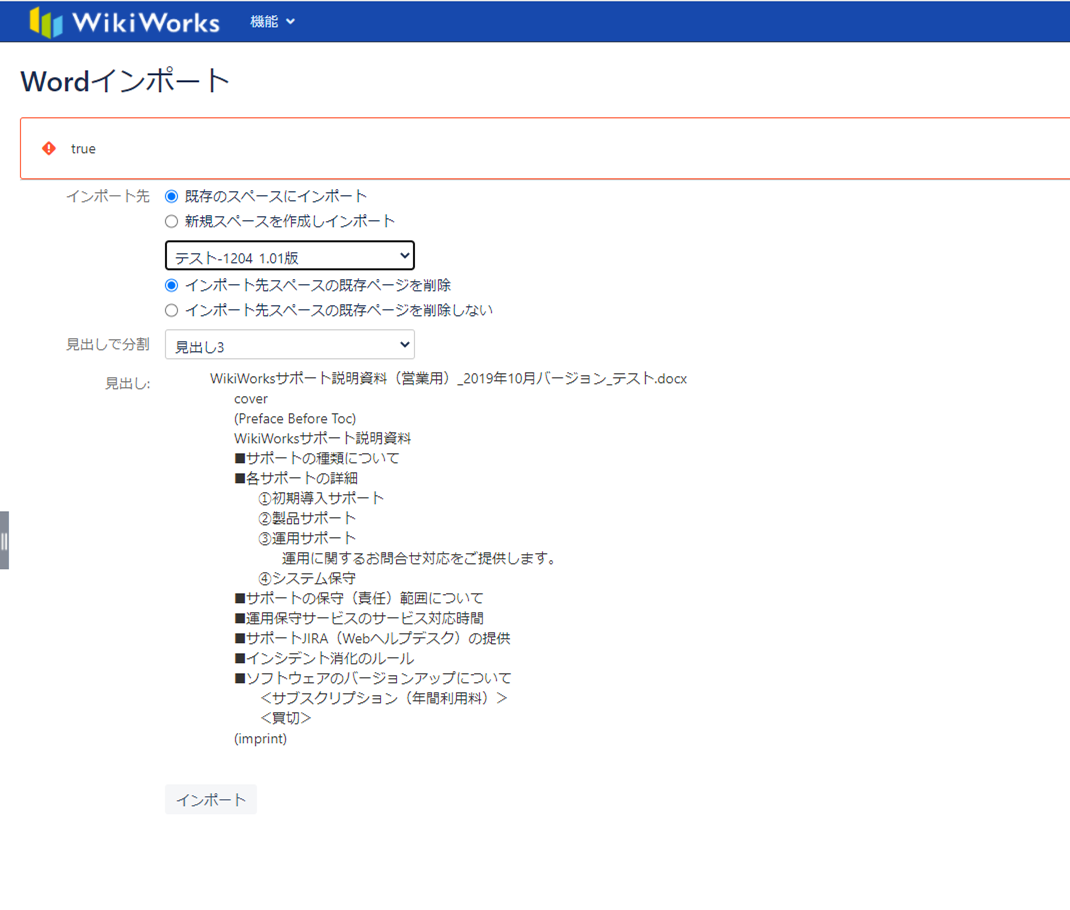 ③ 見出しで分割 見出し1~6を選択して、ページ階層を決めます。 例: 見出し3を選択した場合、見出し3でページを区切ります。 見出し1、見出し2、見出し3でページを区切りますが、見出し4~6はページ区切りをしないので同じページになります。 ④ インポート ③で設定した見出し分割で取り込み想定の階層が表示されます。 問題なければ「インポート」ボタンを押すとインポートが開始されます。 インポート設定が完了したら、「インポート」ボタンを押すとインポートが開始します。