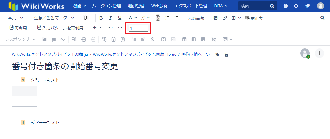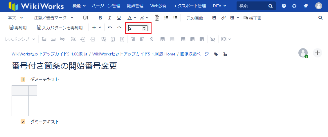 カーソルの配置された行に番号付箇条が設定されていた場合、下記画像の赤枠の数字が箇条書きの開始番号に対応しています。